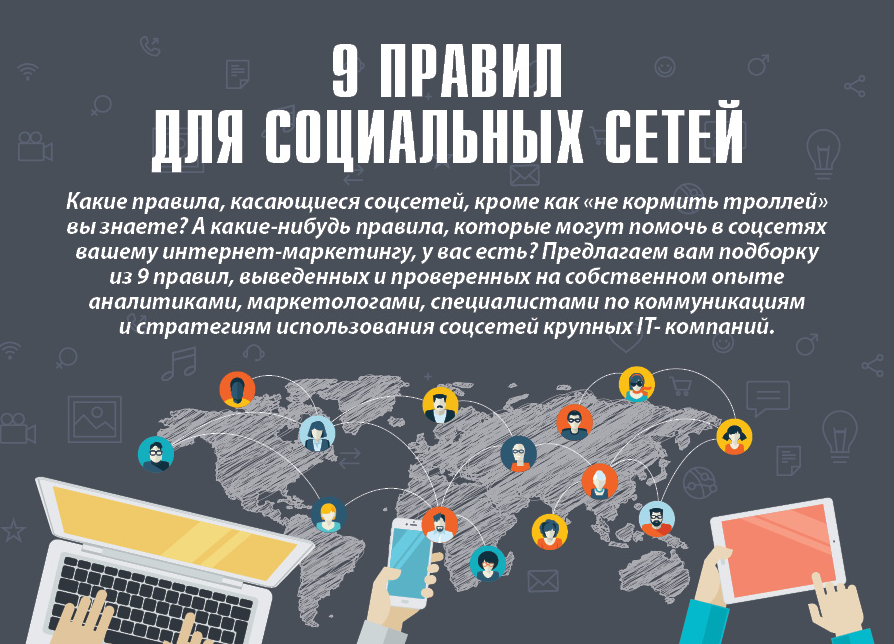 Какие правила, касающиеся соцсетей, кроме как «не кормить троллей», вы знаете? А какие-нибудь правила, которые могут помочь в соцсетях вашему интернет-маркетингу, у вас есть? Предлагаем вам подборку из девяти правил, выведенных и проверенных на собственном опыте аналитиками, маркетологами, специалистами по коммуникациям и стратегиям использования соцсетей крупных IT-компаний.