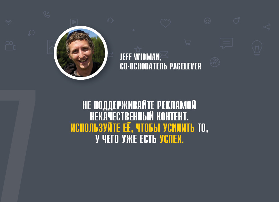- «Не поддерживайте рекламой некачественный контент. Используйте ее, чтобы усилить то, у чего уже есть успех» (Jeff Widman, сооснователь PageLever).