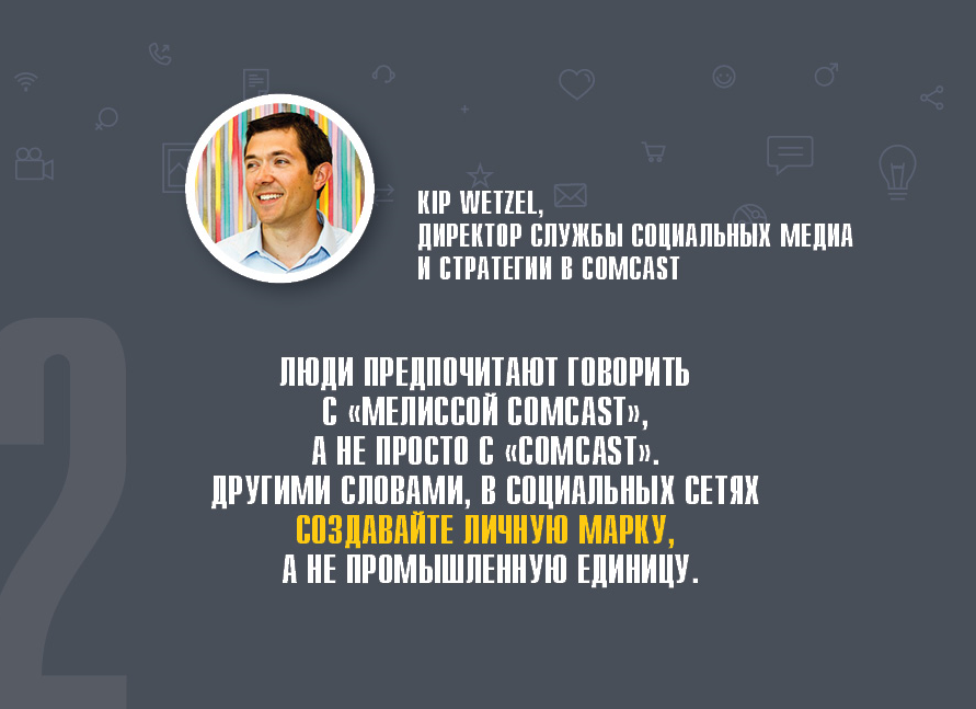 - «Люди предпочитают говорить с Мелиссой Comcast, а не просто с Comcast. Другими словами, в социальных сетях создавайте личную марку, а не промышленную единицу» (Kip Wetzel, директор службы социальных медиа и стратегии в Comcast).