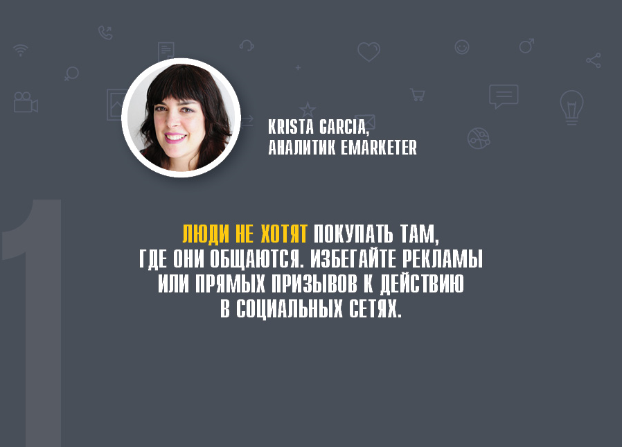 - «Люди не хотят покупать там, где они общаются. Избегайте рекламы или прямых призывов к действию в социальных сетях» (Krista Garcia, аналитик eMarketer).