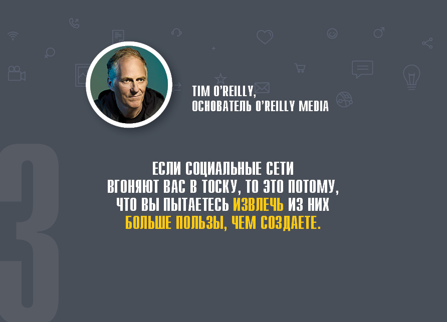 - «Если социальные сети вгоняют вас в тоску, то это потому, что вы пытаетесь извлечь из них больше пользы, чем создаете» (Tim O’Reilly, основатель O’Reilly Media).