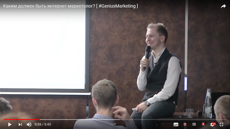 В роликах Genius Marketing отец-основатель компании Олесь Тимофеев появляется в роли эксперта и руководителя большой команды. Он делится секретами бизнеса и дает практические советы новичкам. Все это призвано сформировать его образ авторитетного, но демократичного тренера. Здесь же можно увидеть фрагменты его тренингов по бизнесу в Интернете.