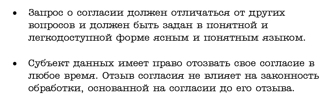 Статья 7 уточняет условия для согласия субъекта данных на сбор и обработку информации: