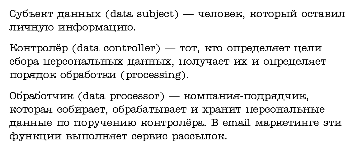 Поскольку обработкой и хранением собранных данных занимается сервис рассылки, убедитесь, что он в своей работе тоже соблюдает требования Регламента GDPR.