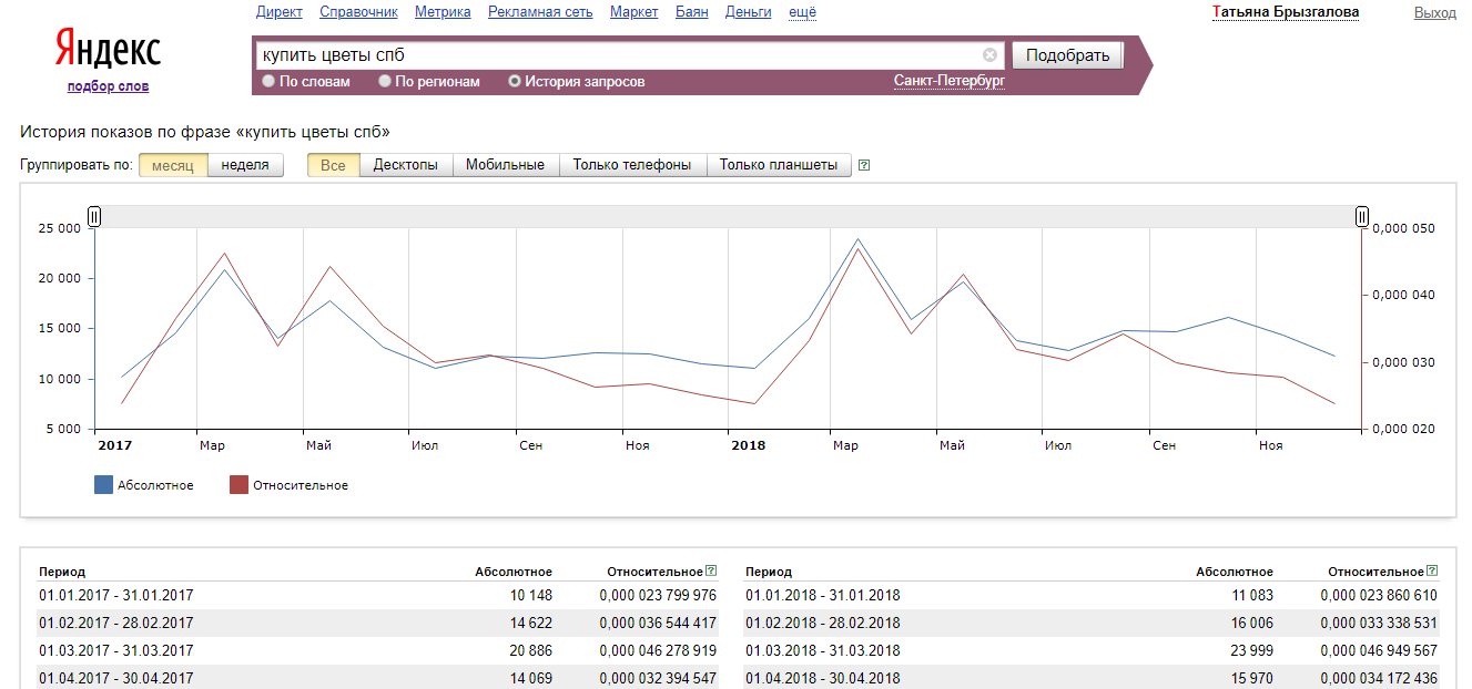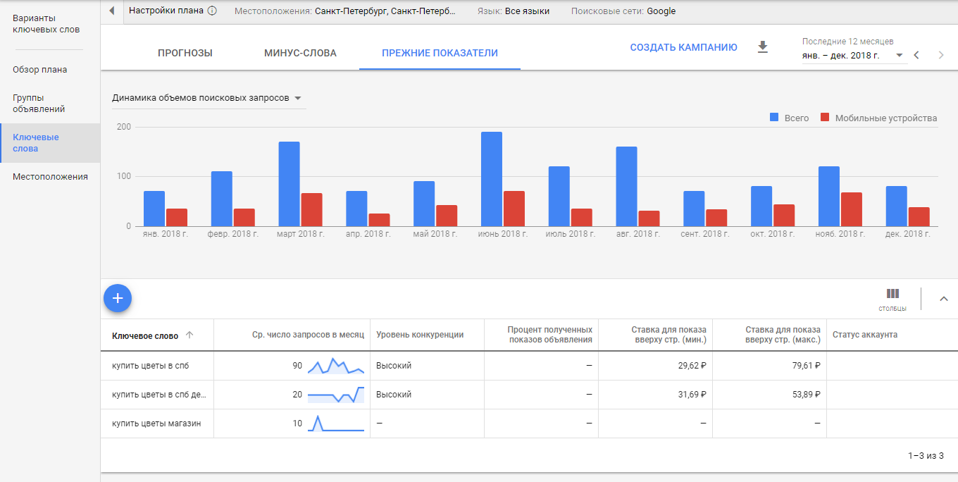 Кроме того, можно, как и в «Яндексе», оценить сезонность спроса, перейдя во вкладку «Прежние показатели».