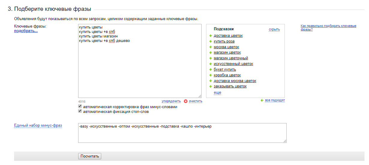 В примере использована фраза «купить цветы спб». И раз бизнес локальный, то использована настройка сервиса под Санкт-Петербург. Ключевые слова собираем из левой колонки. Выбираем подходящие запросы и минусуем все нерелевантное и некоммерческое. Запросы с нерелевантным содержанием собираем в отдельный список минус-слов, чтобы указать эти минус-слова при расчете бюджета. Например, в данном примере третий запрос — «искусственные цветы купить +в спб». Сохраняем «искусственные» в список минус-слов, чтобы с упоминанием «искусственные» показа рекламы не было. Так мы можем отсекать нецелевые показы уже в самой рекламе.