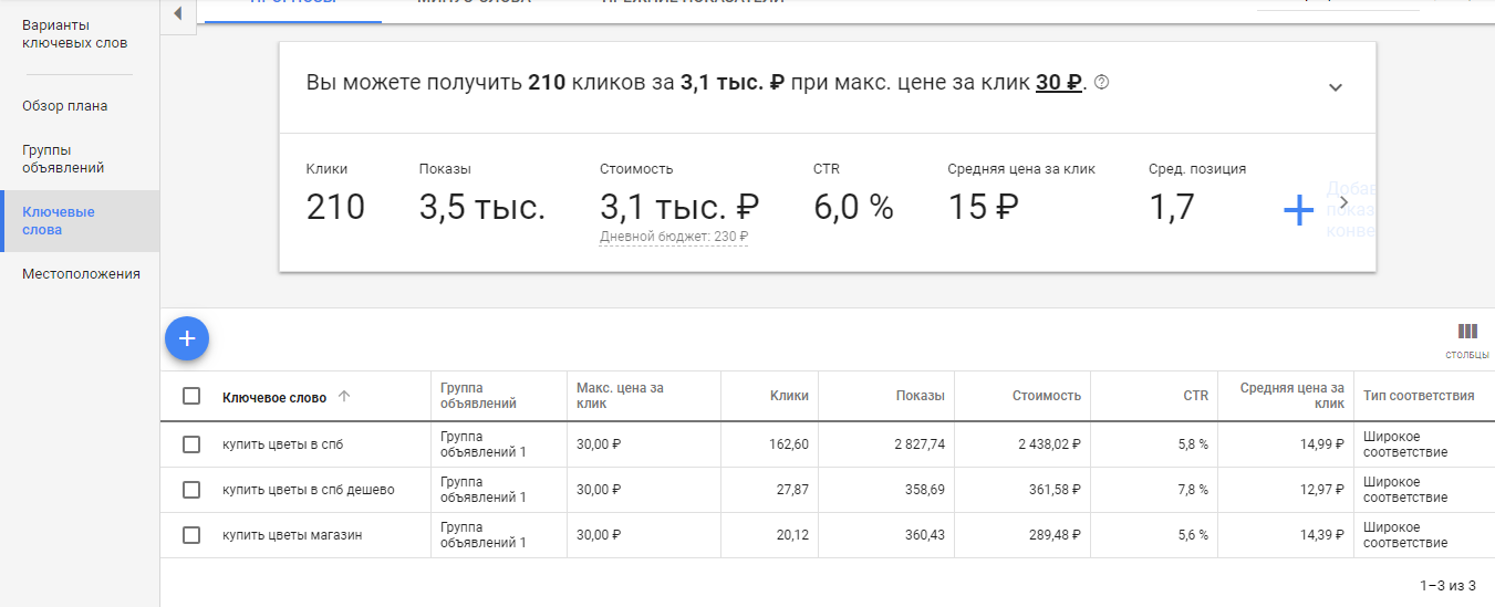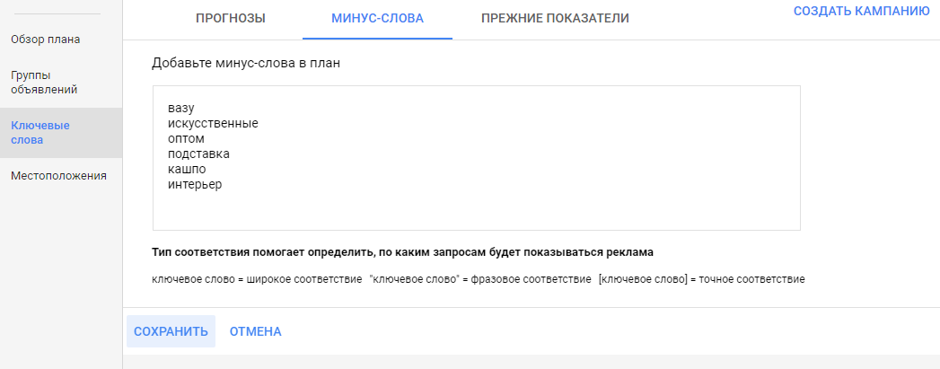В примере видим, что рекомендуемый рекламный бюджет немного уменьшился только с добавлением минус-слов и уточнением географии показа.