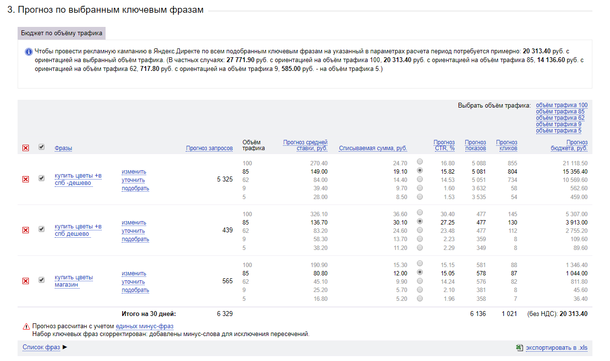 В итоге получаем прогноз бюджета по выбранным ключевым фразам. В получившейся таблице устанавливайте чекбокс на уровне трафика, который желаете получать, чтобы определить необходимые затраты. Для того чтобы рекламное объявление попадало в верхний рекламный блок сразу после строки ввода поискового запроса, необходимо получать не менее 85% трафика.