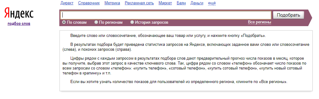 Чтобы воспользоваться «Подбором слов», необходимо залогиниться в сервисах «Яндекса», перейти по ссылке wordstat.yandex.ru и ввести необходимый запрос.