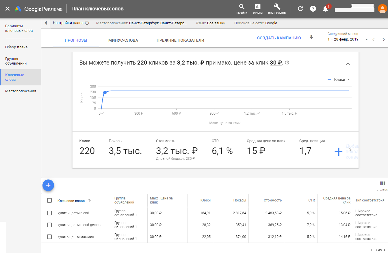 И получаем обзор плана, в котором видим, какое количество кликов можем получить при заданной максимальной цене клика, месячный рекламный бюджет, предположительный CTR и среднюю позицию рекламного объявления.