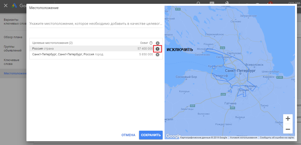 Меняем местоположение под регион бизнеса. Автоматически регион указан — вся Россия, поэтому после добавления города или региона бизнеса Россию необходимо исключить.