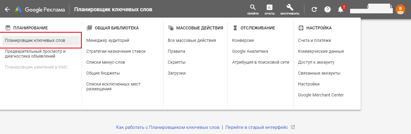 Чтобы воспользоваться сервисом «Планировщик ключевых слов», необходимо создать аккаунт Google Ads. Без аккаунта Google Ads этот сервис не будет доступным. В разделе «Инструменты» выберите «Планировщик ключевых слов».