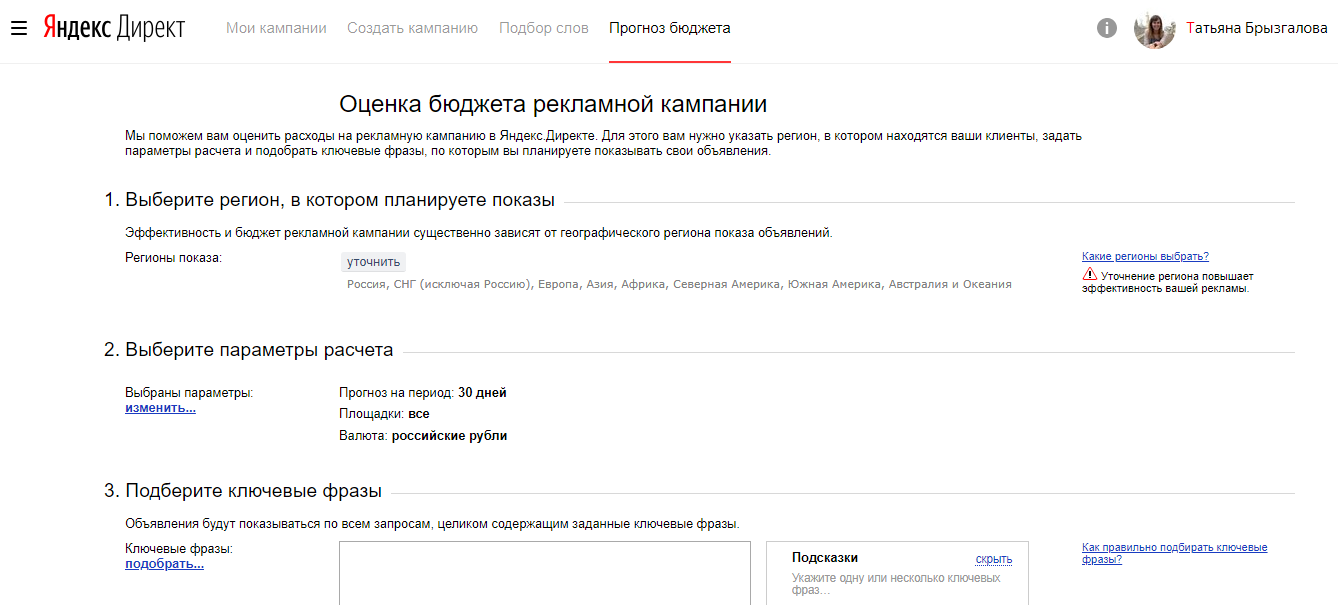 У вас есть готовый список ключевых слов и минус-слов. Теперь приступим непосредственно к расчету прогнозного бюджета в сервисе «Яндекса» «Прогноз бюджета». Для работы в этом сервисе необходимо также залогиниться в сервисах «Яндекса» и перейти по ссылке https://direct.yandex.ru/registered/main.pl?cmd=advancedForecast.