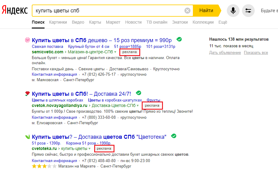 Есть небольшой лайфхак, как предположить, насколько сильно может измениться цена уже в рекламном кабинете. Для этого вводите в «Яндексе» при заданном гео ключевое слово, использованное при подсчете бюджета. Например, если вы продаете цветы в СПб, то настройки «Яндекса» должны быть выставлены для Санкт-Петербурга, если в момент проверки вы находитесь в другом городе. При высокой конкуренции (по четыре рекламных объявления в верхнем и нижнем рекламных блоках) цена клика может оказаться ниже до 20%. При низкой конкуренции можно скинуть цену клика еще больше. По такому же принципу можно оценивать конкуренцию в Google.