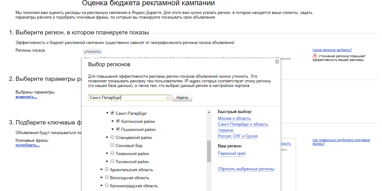 1. Выбираем регион, в котором планируем проводить показы рекламы, в раскрывающемся меню или находим название города или области через поле ввода.