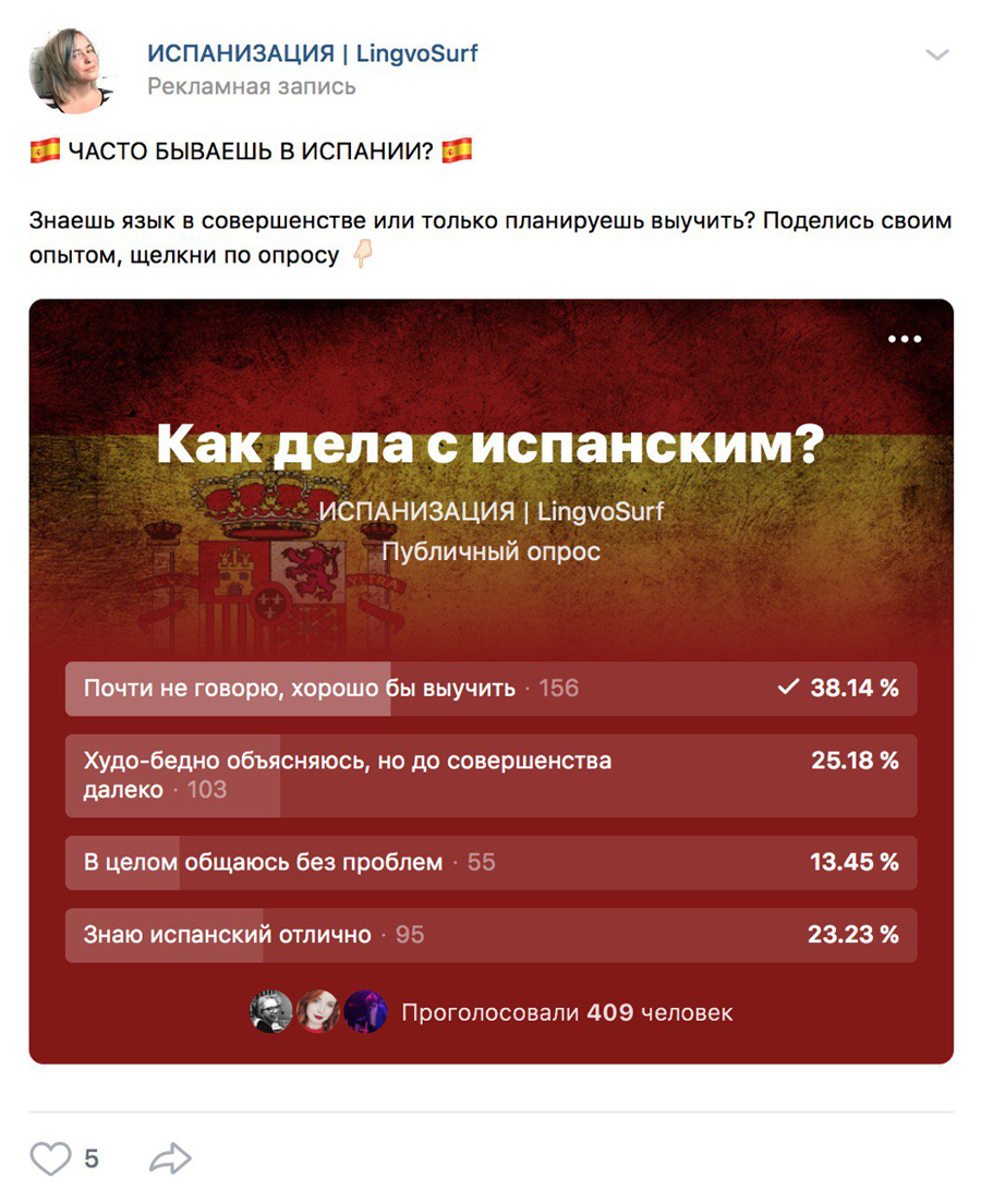 Я регулярно использую еще и такой инструмент, как опросы. Интересно, что люди во «ВКонтакте» охотнее участвуют в опросах, чем лайкают. Опрос — это отличная возможность получить потенциальных лидов. К примеру, недавно я запускала опрос: «Хотите ли вы получить консультацию косметолога по услуге ХХХХ?» Варианты ответов были такие: а) да, хочу; б) нужно подумать; в) нет; г) нужна консультация, но по другому вопросу. Из 139 человек, которые проголосовали, «да, хочу» выбрали 77 человек. Затем администратор аккаунта связался с ними и уточнил, что именно они хотят получить.