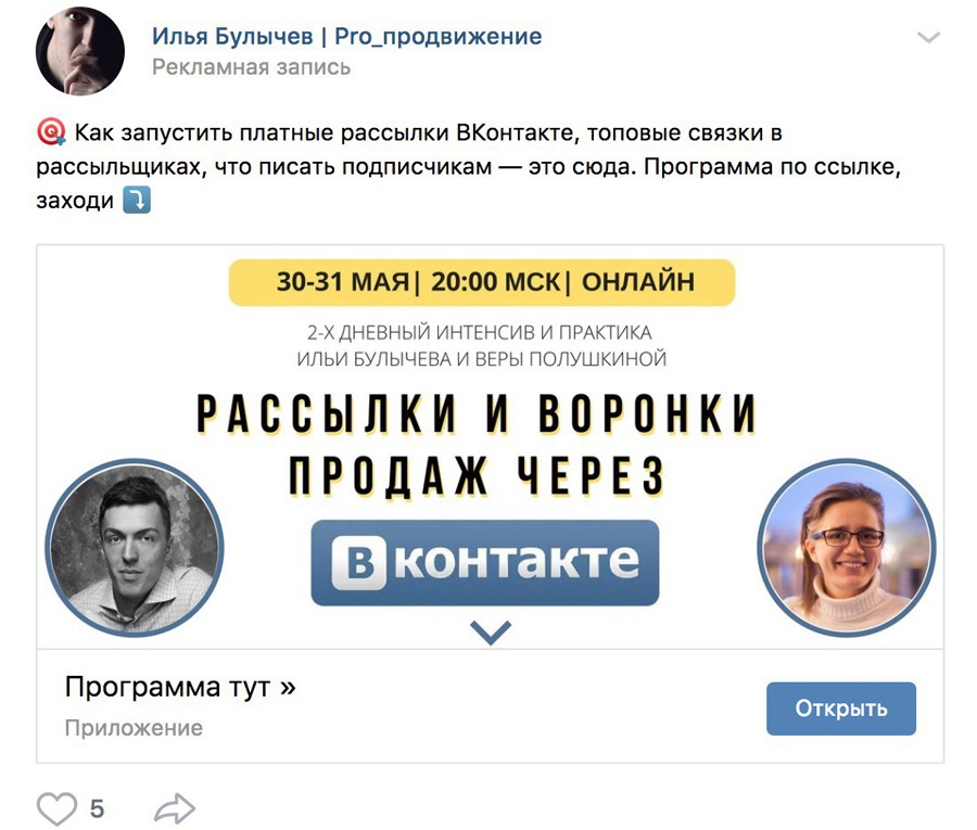 Поэтому я предпочитаю не выводить людей во внешний мир, а давать возможность оставаться в привычных и комфортных границах соцсети. Веду трафик в группу «ВК», там устанавливаю приложение-рассыльщик. Это аналог email-рассылок, только внутри «ВКонтакте». Основными задачами рассылок являются прогрев аудитории и подготовка к продаже. Главным преимуществом этого сервиса является то, что пользователи «ВК» получают ваши сообщения от имени вашей группы прямо в свои личные сообщения. Процент открытия таких сообщений в разы больше, чем писем на электронной почте.