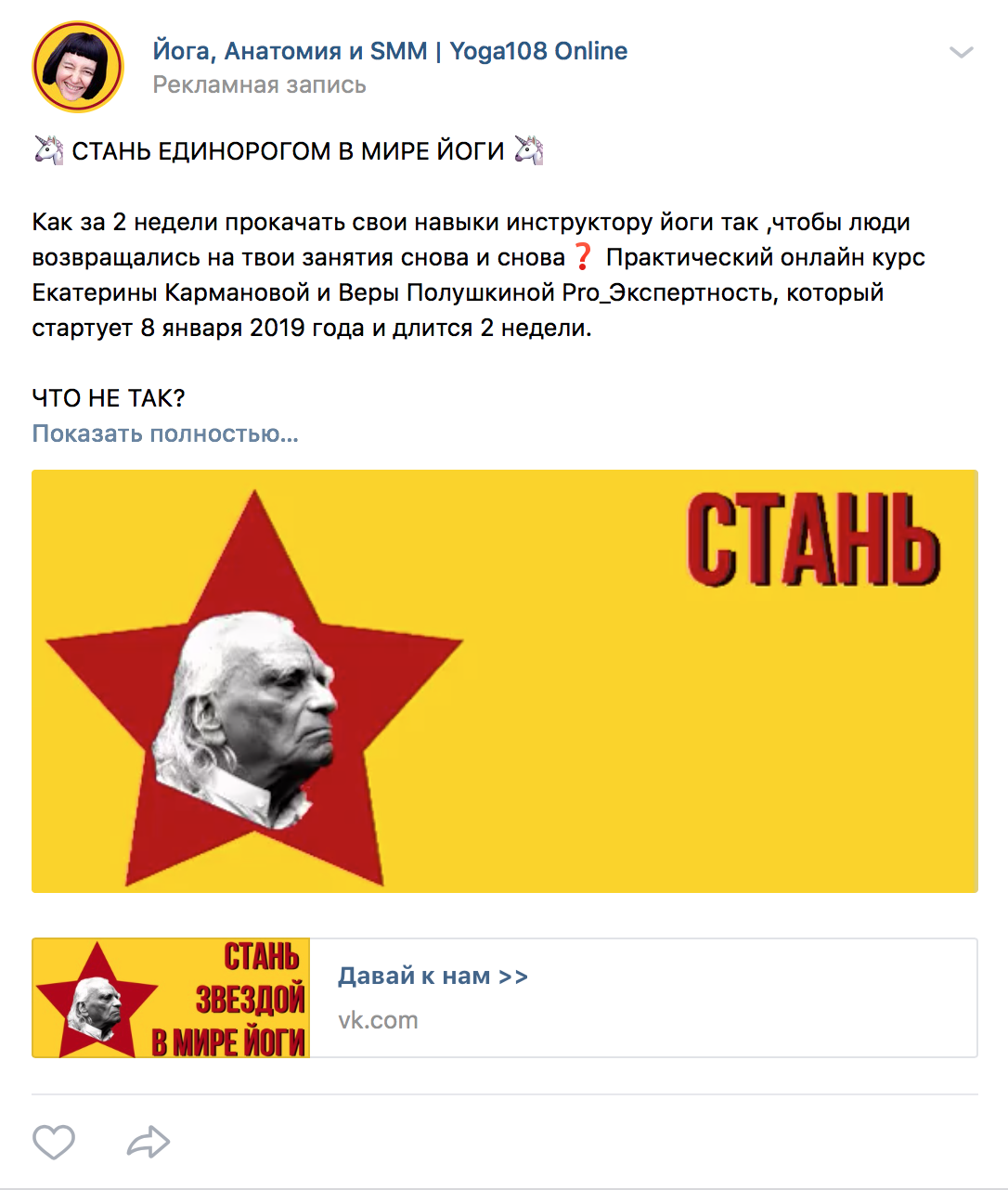 Надо помнить, что пользователи соцсетей бывают настолько невнимательными, что часто просто не видят, где ссылка и куда нужно ткнуть. Поэтому призыв к действию и сама ссылка не должны оказаться последней строчкой в вашем рекламном объявлении. Так они могут просто затеряться. Лучше после ссылки еще написать пару строчек. Я видела, как у Ольги Юрковской ссылка в рекламном посте повторялась 3 раза подряд. Такую ссылку точно не пропустишь.