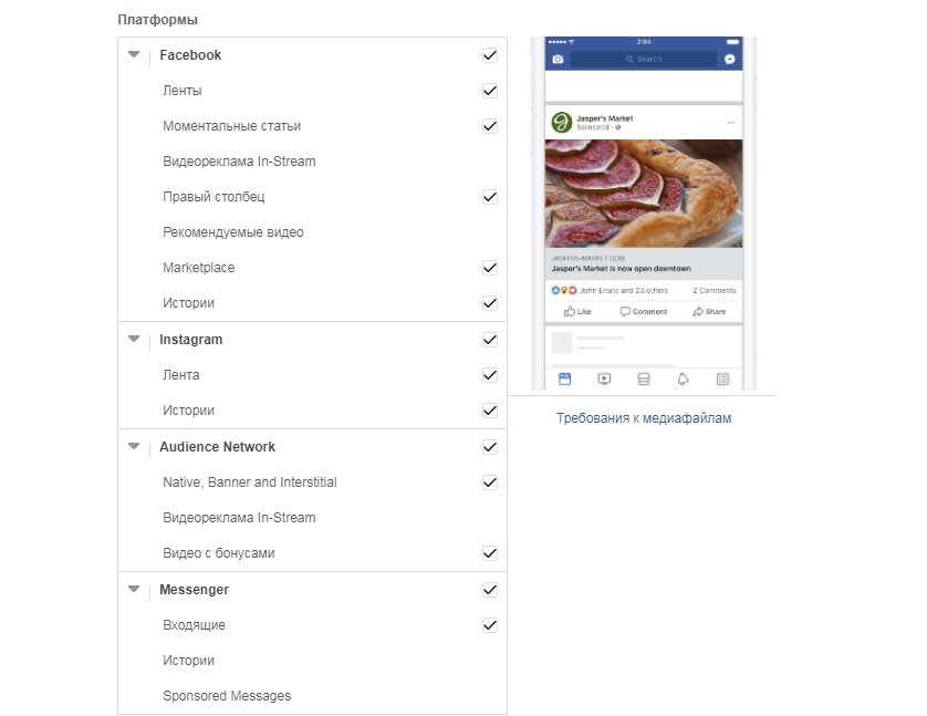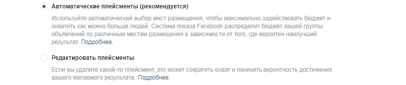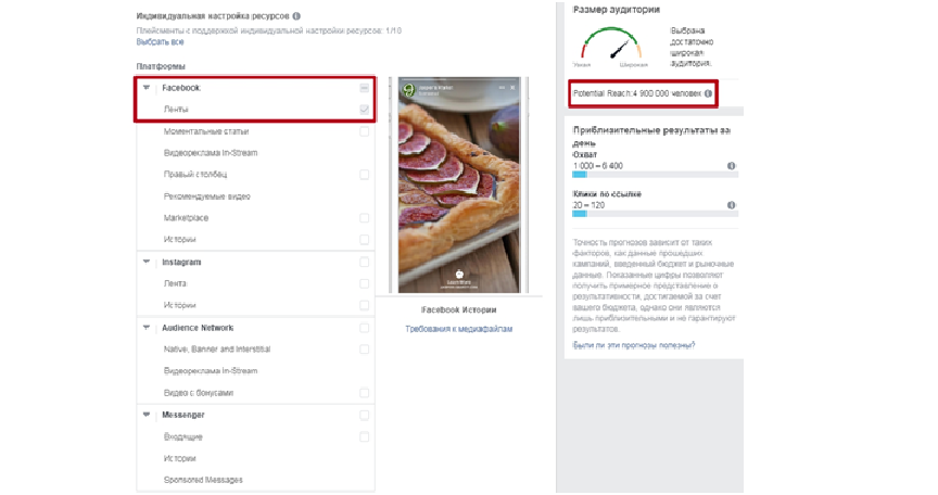 В этом примере показатели ширины в 19 миллионов человек основаны на автоматических местах размещения, или же, другими словами, автоматических плейсментах. Эти места размещения выбираются по умолчанию. Там включены всевозможные варианты, где Facebook покажет рекламу, в том числе Messenger, Instagram и др.
