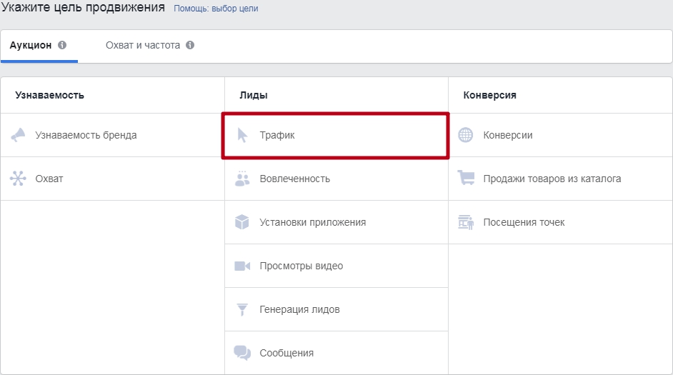Далее мы выбираем любую рекламную цель, на данном этапе пусть это будет трафик: