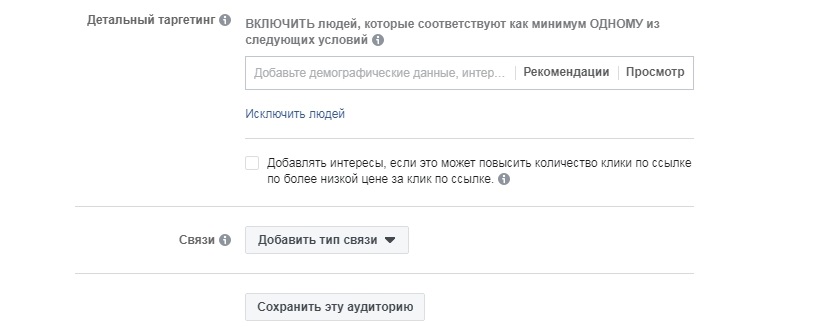 Пример был показан без выбора интересов, сужений и иных деталей таргетинга. В обоих случая аудитория очень широкая, поэтому, конечно, надо использовать иные возможности детального таргетинга, которые нам представлены чуть выше, для ее уменьшения.