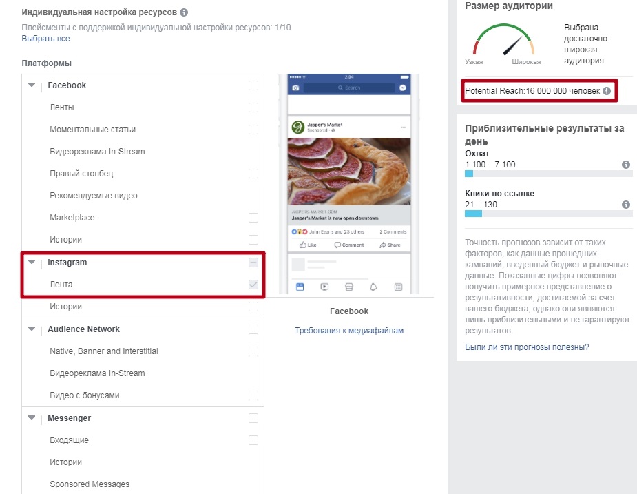 Зачастую просмотр ширины аудитории сразу дает возможность понять, в каком направлении двигаться. Если вы даете рекламу на B2B-продажи для мужчин среднего возраста, то в Facebook ваша аудитория наверняка окажется шире и качественнее. Если у вас продажа из категории импульсных покупок, то тут Instagram, скорее всего, покажет более высокую конверсию.