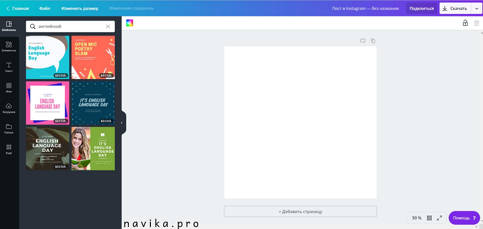 Пройдя авторизацию, в поисковой строке находим нужное направление дизайна, после выбора которого пользователь оказывается непосредственно в окне редактора. Шаблонов в сервисе много, есть разделы по популярным тематикам вроде распродаж, еды, но если сразу не нашли интересующий, воспользуйтесь поисковой строкой. Конструктор адаптирован под русскоязычный рынок, потому запросы тематики можно делать на русском.