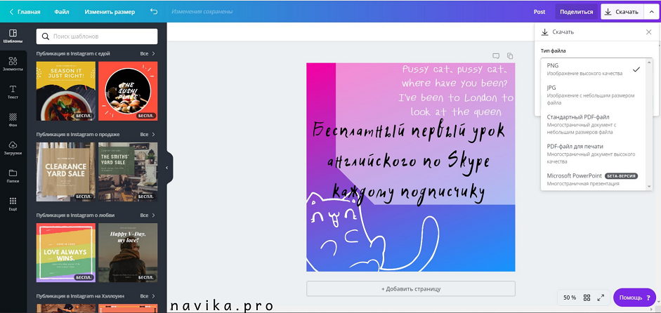 Когда дизайн готов, сохранить его можно через кнопку на панели. Рекомендованный формат — PNG, в таком случае изображение будет сохранено в более высоком разрешении. Доступны форматы JPEG и PDF.