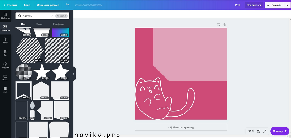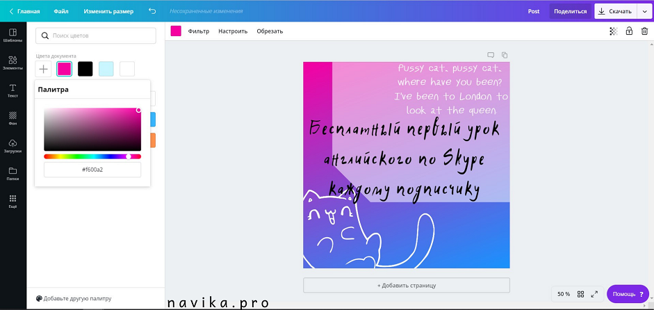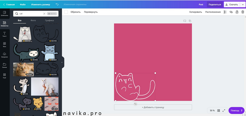 Выбрав шаблон, который вам идеально подходит, можно изменить надпись на необходимую — и дизайн готов. Но часто собственная концепция требует более детальной работы с шаблоном, как в примере. Шаблон устраивает яркостью фона и элементом — рисунком кота, но есть желание добавить детали и, возможно, поменять рисунок. Все это можно сделать на вкладке «Элементы». Фильтрация элементов также доступна по ключевому слову. Рисунки можно менять в части цвета, размера, фото можно отредактировать при помощи фильтров. Все инструменты доступны на верхней панели при выделении элемента.