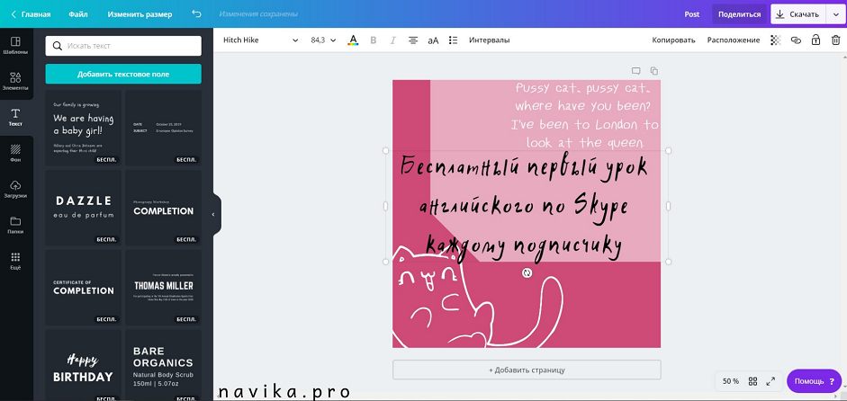 В разделе «Текст» представлены уже готовые шаблоны, многие шрифты в них доступны исключительно на английском языке, потому проще добавить текстовое поле и выбрать шрифт для него из тех, что доступны на кириллице. Русскоязычных шрифтов около 115 штук, и они весьма разнообразны. В трендах 2019 года шрифты bold и handwritten, поэтому они фигурируют в примере.