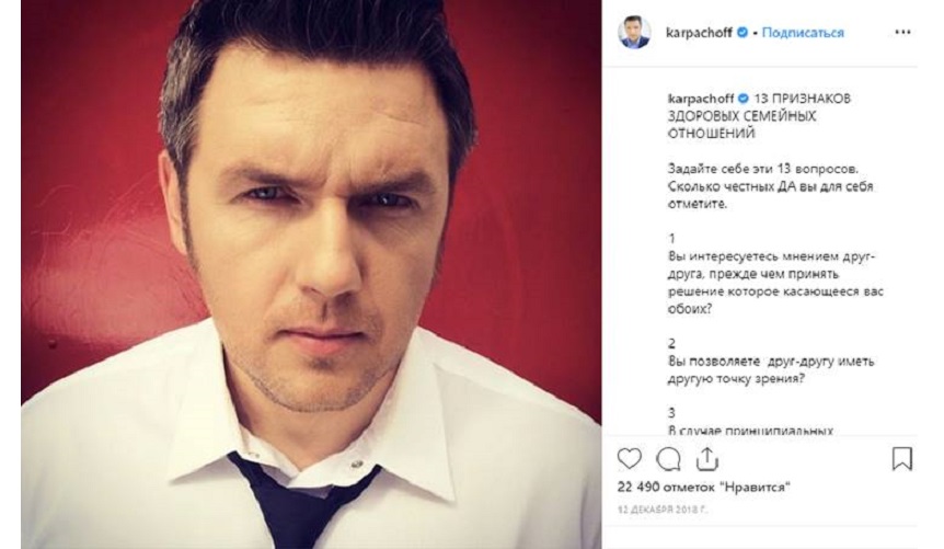 О чем пишет. Дмитрий Карпачев — одна из самых скрытных медиаперсон. Даже день его рождения не известен широкой публике. Во всех его соцсетях («Инстаграм» не исключение) нет никакой личной информации. Только то, что связано с работой. В блоге Дмитрий анонсирует свои трансляции в онлайне, выступления в офлайне, отвечает на вопросы фолловеров и делится лайфхаками для мужчин.