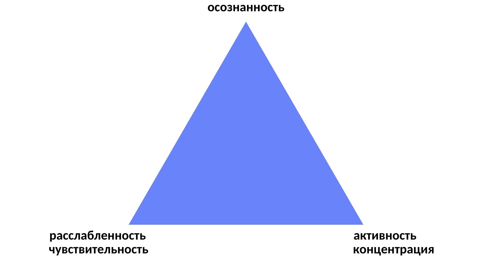 А теперь очень важный момент: мало кто знает, что состояние «плохо» напоминает треугольник, где одна вершина называется словом осознанность, вторая — чувствительность, расслабленность и третья — активность, концентрация. У «пациента» отсутствуют ресурсы для решения проблемы собственными силами, и он хочет, чтобы вы его «улучшили» по какой-то из трех точек треугольника. Как правило, пришедший осознает только один пункт, но в реальности у него одновременно «не работают» все три части.