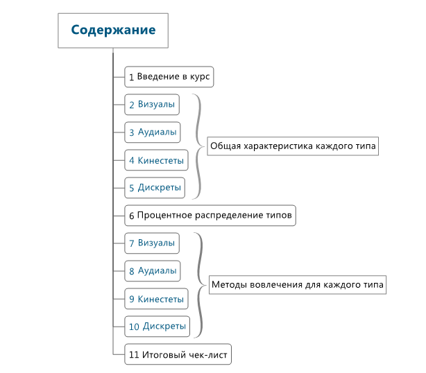 На своем онлайн-курсе «Сенсорная типология личности, или Как обучать визуала, аудиала, кинестетика», например, я обязательно с самого начала рассказываю и показываю на слайде структуру курса (рис. 1), конечно же, использую много слайдов, видео, фото/картинок (для визуалов).