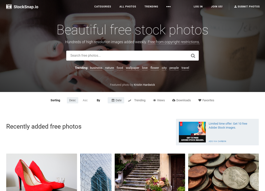 8. Stocksnap.io — на этом фотостоке вы найдете огромное количество новых фотографий. У него приятный интерфейс, имеются подсказки по наиболее популярным поисковым категориям. Также имеется сортировка по дате, количествам скачиваний, лайкам и просмотрам.