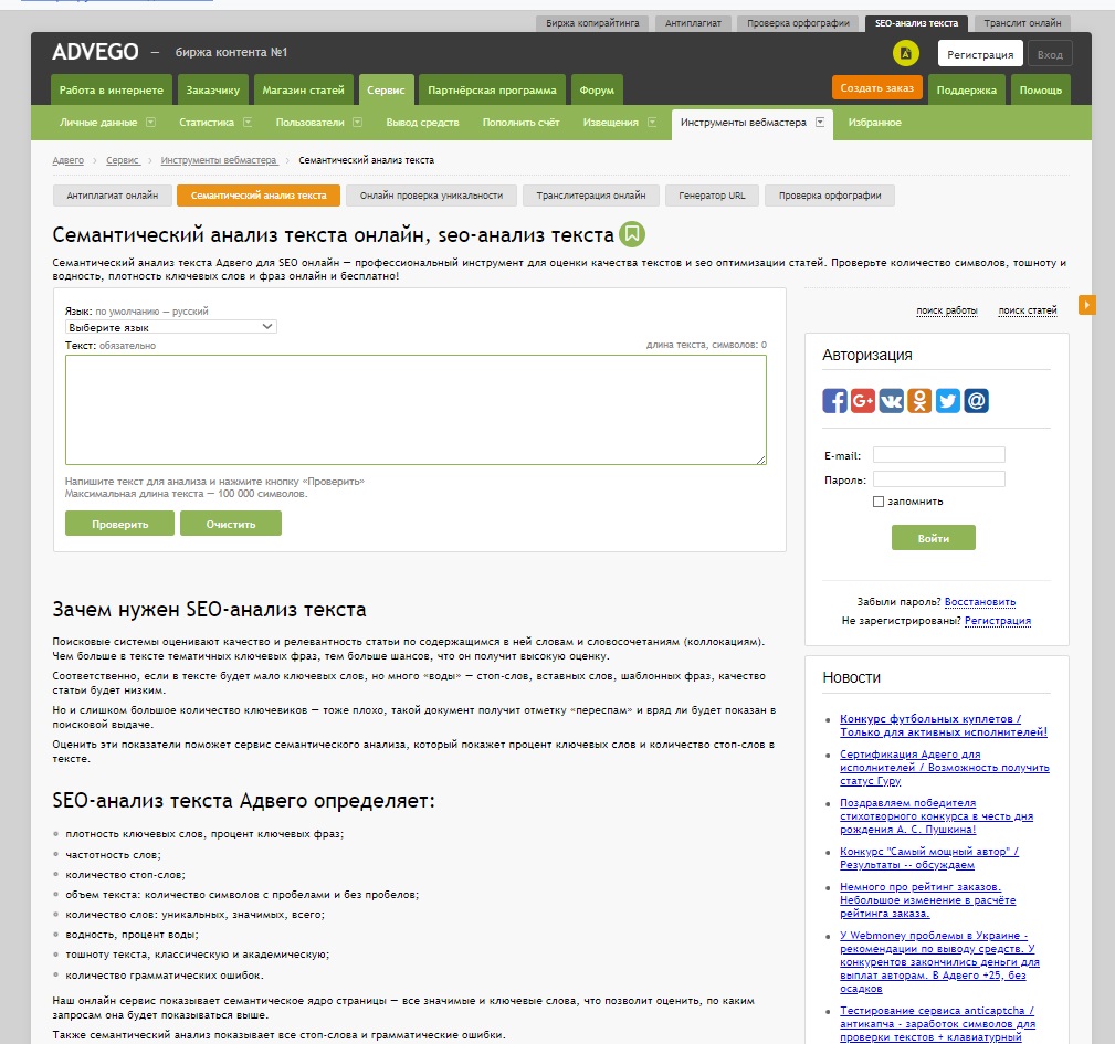 Отдельно хочу отметить еще один сервис от упомянутого выше «Адвего». Анализирует параметры SEO-пригодности текста. Хорош тем, что измеряет параметр «тошноты». Поисковые системы не любят переспам, поэтому от лишних повторяющихся ключей нужно избавляться беспощадно.