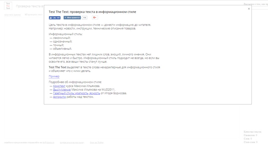 Юзабилити: так себе. Непонятно, что подчеркивает и по каким причинам считает некоторые слова «неправильными». Алгоритм на троечку с плюсом, но для начинающего заказчика сайт может быть полезен в плане оценки качества текста, который «вроде все хорошо, но мне не нравится». Подчеркивает то, что интуитивно режет глаз, и объясняет, почему с вами это происходит.