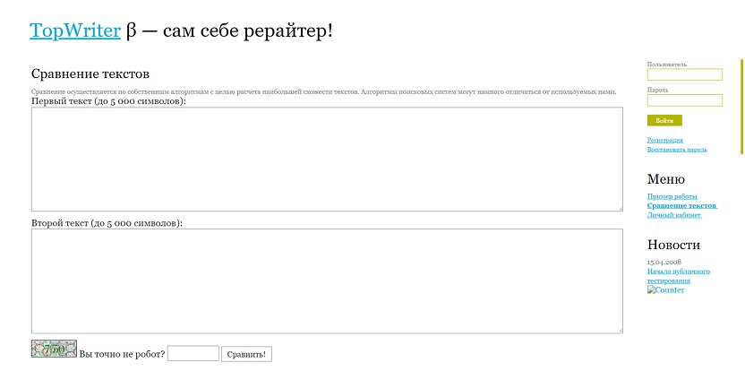 Сервис сравнительного анализа материалов позволяет измерить аналогичность при абсолютной уникальности. Полезен тем, что позволяет обращаться к службе поддержки поисковых систем и добиваться удаления рерайтных материалов из выдачи.