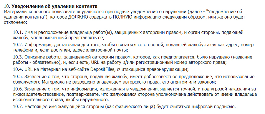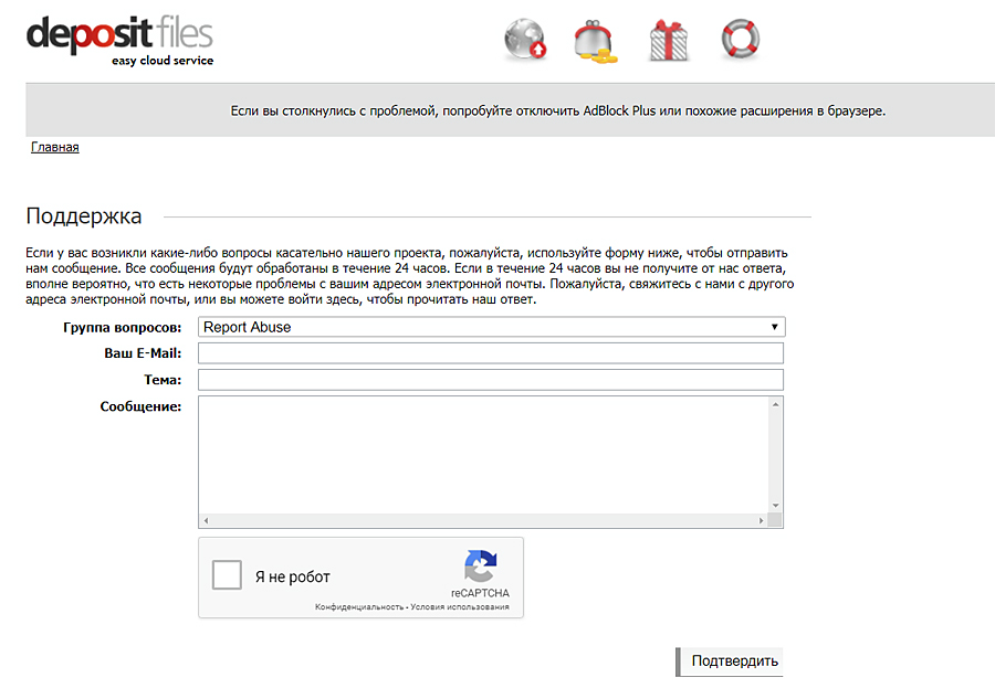 Также пользователь может направить обращение в DepositFiles через форму обратной связи, размещенную на сайте: