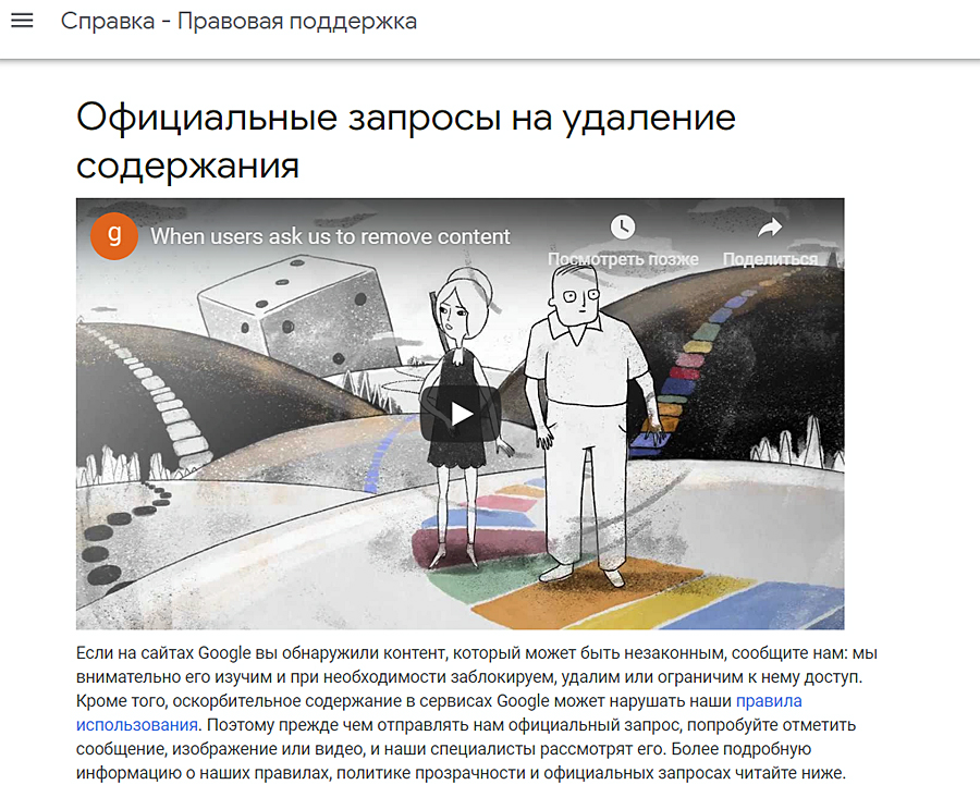 Более подробно о защите информации и авторского права пользователей компания рассказывает на своей странице «Правовая поддержка». Компания Google обязуется реагировать на сообщения о незаконном контенте на своих сайтах.