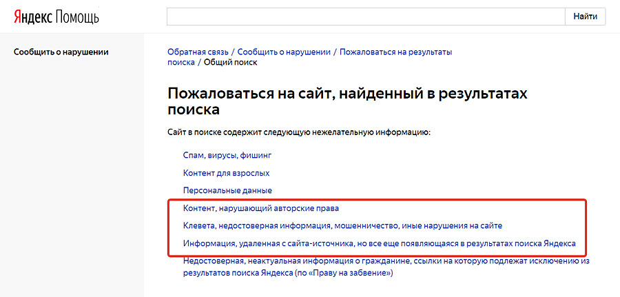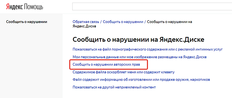 Жалобы на незаконное использование контента подаются через обратную связь «Яндекса».