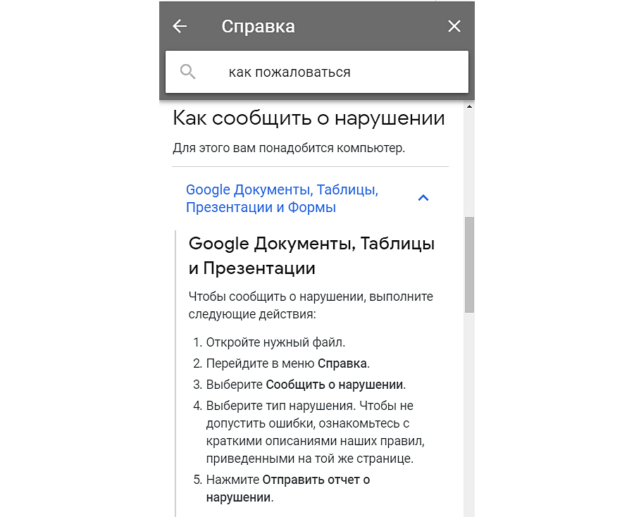 Если вы обнаружили, что ваша статья или иной текст расшарены в виде ссылки на гуглдок, вы можете отправить жалобу прямо из этого документа: