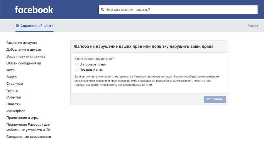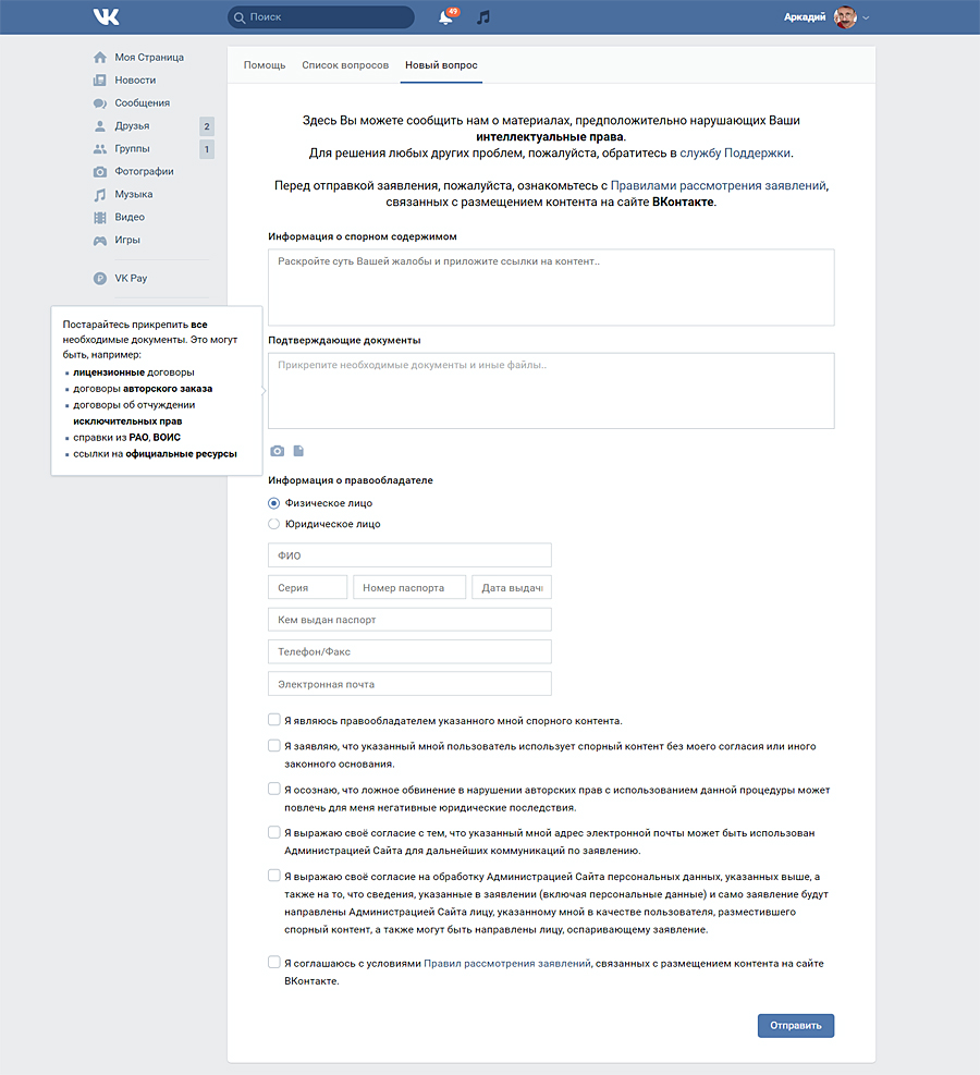 Для жалоб правообладателей в социальной сети «ВКонтакте» существует специальная форма, которая доступна для зарегистрированных пользователей: