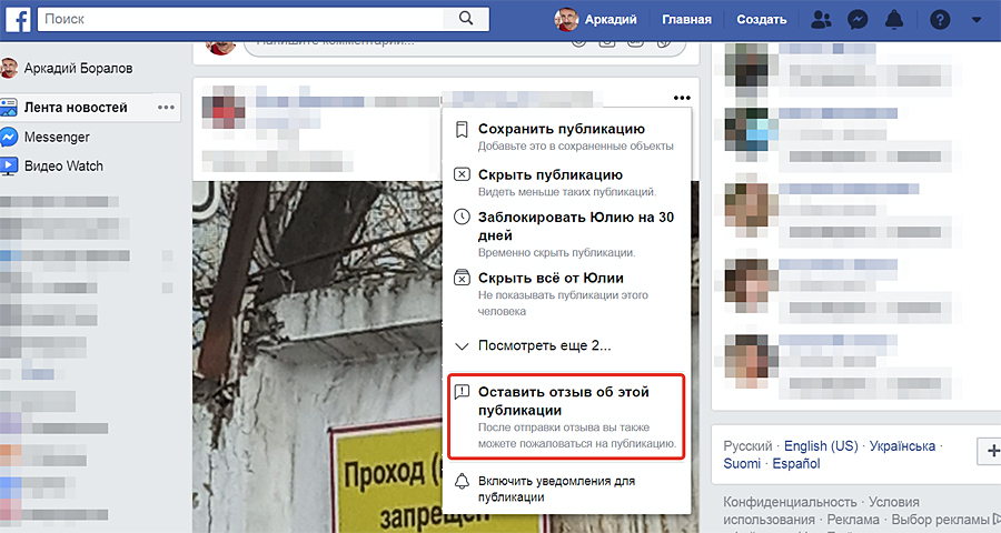 Рядом с заголовком каждого поста в Facebook есть выпадающий список возможных действий с этой публикацией. Выберите пункт «Оставить отзыв и пожаловаться на публикацию», следуйте подсказкам системы.