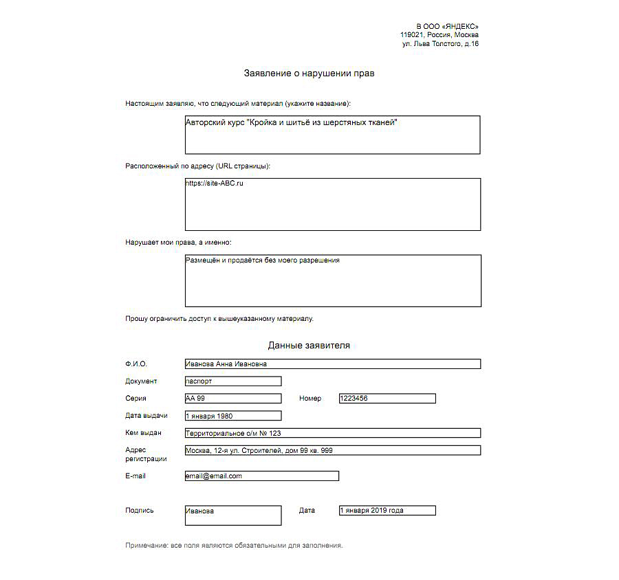 Пример заявления о нарушении авторских прав