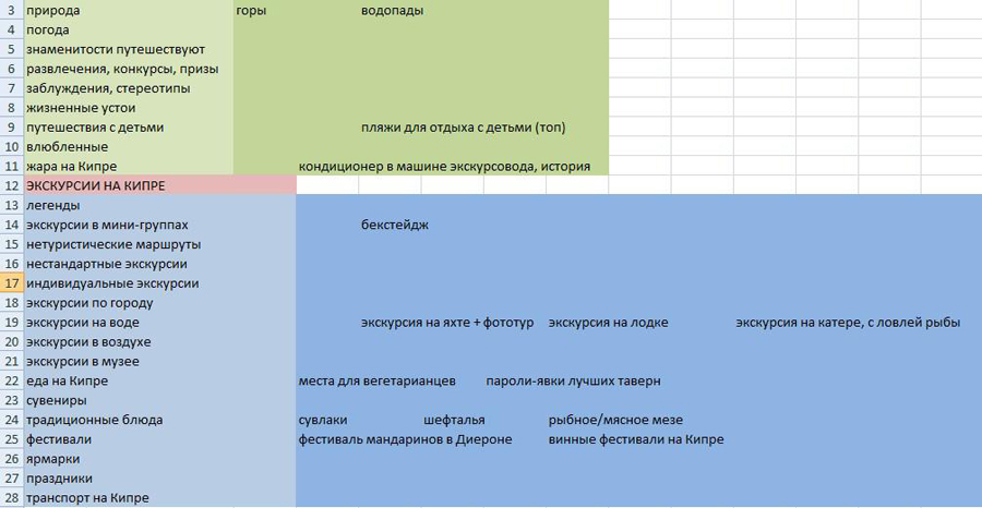 Учитывайте, что ваша целевая аудитория неоднородна. Пишите для разных сегментов. Например, у тех, кто проводит экскурсии на Кипре, ЦА поделена на тех, кто путешествует с детьми, заказывает экскурсии в мини-группах и ищет индивидуальные экскурсии. И это еще не все сегменты! Поэтому включите в календарный план по одной прицельной публикации. Выбирайте темы из разных блоков. Посмотрите для примера не заполненную до конца матрицу, в которой точка отсчета — «Экскурсии на Кипре».