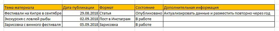 В плане обязательно нужно фиксировать статус материала: в работе, у редактора, на оформлении и пр. Тогда план помогает координировать подготовку и публикацию материалов.