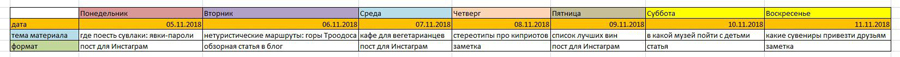Итак, у вас есть много идей. Теперь нужно решить, в какие дни целесообразнее размещать материалы на выбранные темы. Вариантов начертить календарный план много. Как пример:
