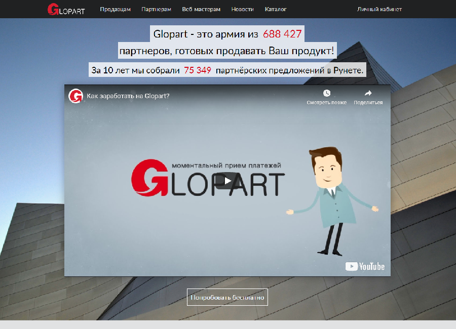 Glopart (www.glopart.ru) — это сервис моментального приема платежей. Продажа товара происходит в любое время суток. Кроме этого, вы можете выстраивать двухуровневую партнерскую программу для каждого товара от 10% до 100%, анализировать статистику по партнерам и заказам, интегрироваться с сервисами рассылок.