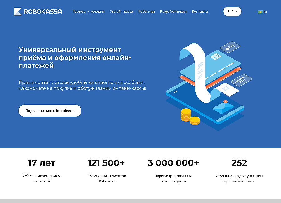 RoboKassa (www.robokassa.com) — представляет собой платформу для интернет-эквайринга с подключением к интернет-магазину или сайту в 252 странах мира. У вас есть возможность принимать платежи за товары и услуги через банковские карты, терминалы, электронные деньги, интернет-банки и мобильных операторов.