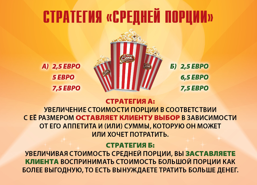 Стратегия Б: увеличивая стоимость средней порции, вы заставляете клиента воспринимать стоимость большой порции как более выгодную, то есть вынуждаете тратить больше денег.